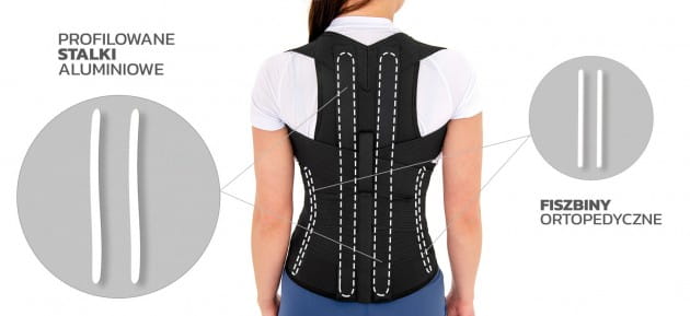 W tylnej części ortezy zainstalowano, w zależności od rozmiaru, dwie lub cztery fiszbiny ortopedyczne i wysoki aluminiowy stelaż kręgosłupa. Fiszbiny ortopedyczne posiadają ściśle określony stopień elastyczności, który uzyskano w procesie hartowania oraz zostały w profesjonalny sposób zabezpieczone farbą proszkową, co uodporniło je na działanie ludzkiego potu.