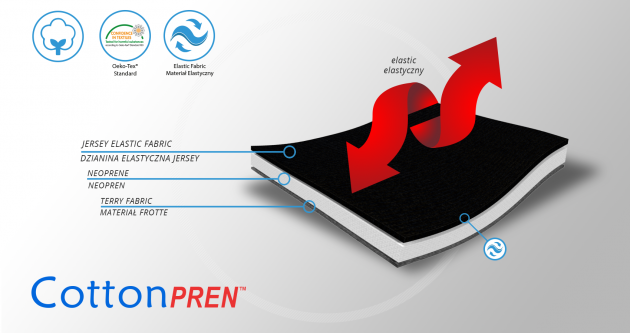 Orteza ENDURO 2 została wykonana z innowacyjnego, mocno kompresyjnego i przyjaznego dla skóry surowca: CottonPren. Surowiec ten składa się z mięsistej, komfortowej pianki neoprenowej, zlaminowanej zewnętrznie z poliestrową dzianiną okładkową, wewnętrznie zaś z bawełnianą elastyczną dzianiną frotte. Dla poprawy komfortu użytkowania wyrobu i lepszego odprowadzania przez niego potu, frota została wykończona w specjalistyczny sposób, gwarantujący pełną realizację tych funkcji.