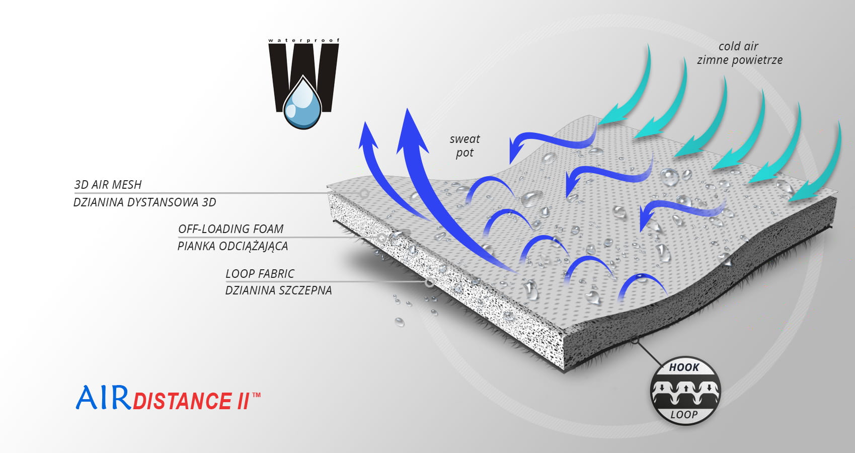 AirDistance II to innowacyjny technologiczny surowiec przeznaczony do wykonywania wysoko przetworzonych wyrobów ortopedycznych. AirDistance II jest surowcem trójwarstwowym, składającym się z bardzo mocnej poliamidowej dzianiny okładkowej z funkcją samoszczepną, odciążającej pianki EVA oraz poliamidowej dzianiny przestrzennej 3D. Zewnętrzna warstwa surowca pozwala na swobodne mocowanie na niej wszelkich usztywnień ortopedycznych, a funkcja samoszczepna ułatwia dopasowanie wyrobów. Pianka odciążająca EVA niweluje negatywne oddziaływanie usztywnień ortopedycznych na ciało pacjenta. Wewnętrzna dzianina 3D o przestrzennej strukturze, pozwala na swobodne przepływanie przez nią powietrza , które dotlenia skórę oraz powoduje, że pot znajdujący się na jej powierzchni zdecydowanie szybciej odparowuje. Funkcja samoszczepna, surowca AirDistance II zdecydowanie ułatwia użytkowanie. Surowiec wodoodporny.