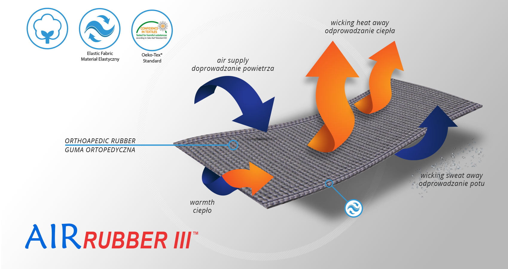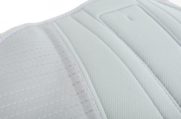 Boki sznurówki wykonano ze specjalnej przestrzennej bardzo mocnej gumy ortopedycznej AirRubber II, która charakteryzuje się jednokierunkową elastycznością oraz uzyskaną w procesie dziania strukturą 3D. Struktura gumy pozwala na łatwiejsze oddychanie skóry co poprawia komfort użytkowania wyrobu.